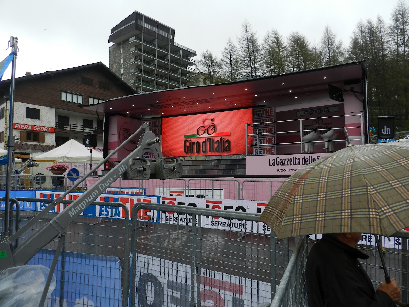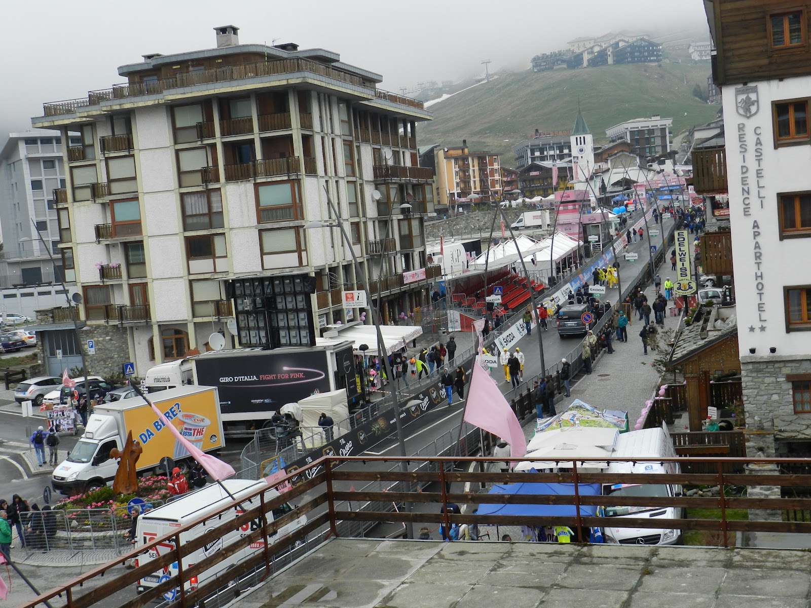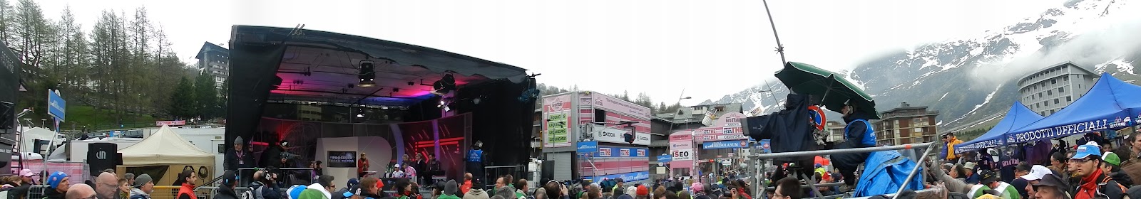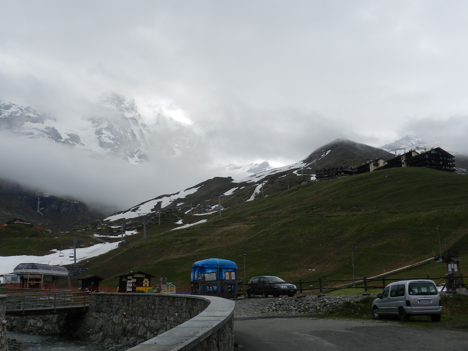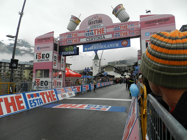 I took a 2 day trip to Italy this w-e... People were asking me why I would even go there for that short time. Actually, the Giro d'Italia (famous bike race around Italy) was not so far away from Switzerland. There was a stage ending in Cervinia (2050m), a city on the Italian side of the Matterhorn. I left on Saturday morning and arrived in Cervinia around noon. The weather was not so nice but believe it or not, the ski resort was open ! I didn't have my skis :(